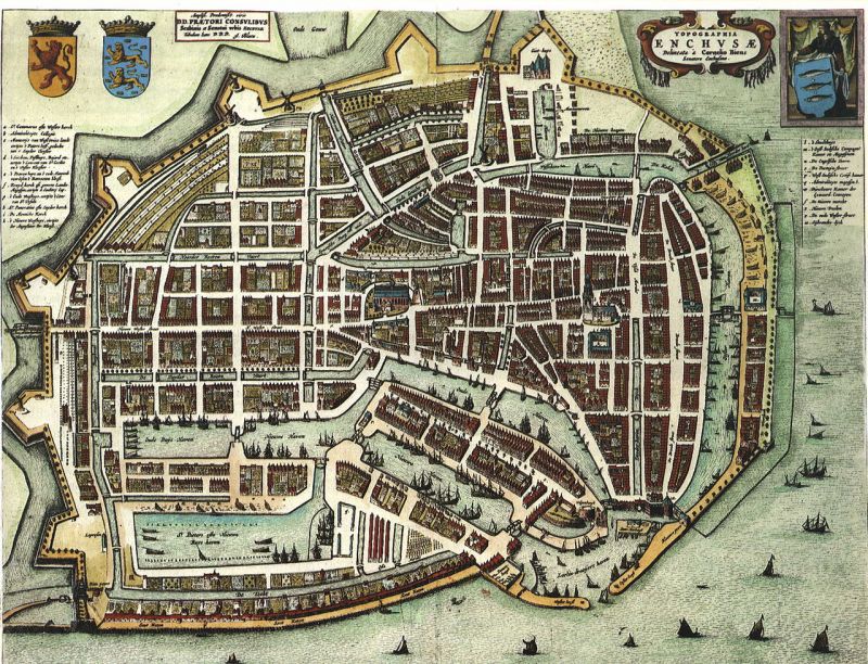 Het door grachten doorsneden stadje Enkhuizen ligt voor een groot deel binnen de goed intact gebleven 16e-eeuwse omwalling.
